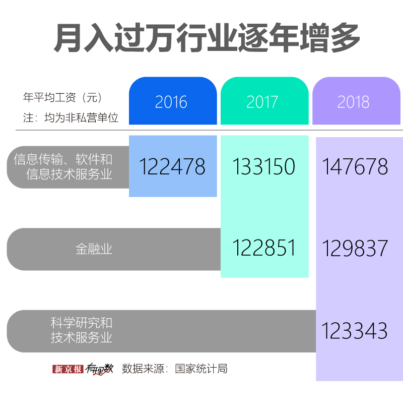 其中,在非私營單位,信息傳輸、軟件和信息技術服務業,金融業,科學研究和技術服務業三個行業員工年平均工資分別達147678元、129837元、123343元,跨入“月入過萬“的高收入羣體行列,分別為全國平均水平的1.79倍、1.57倍和1.5倍。近三年來,員工平均工資月入過萬的行業一年增加一個。