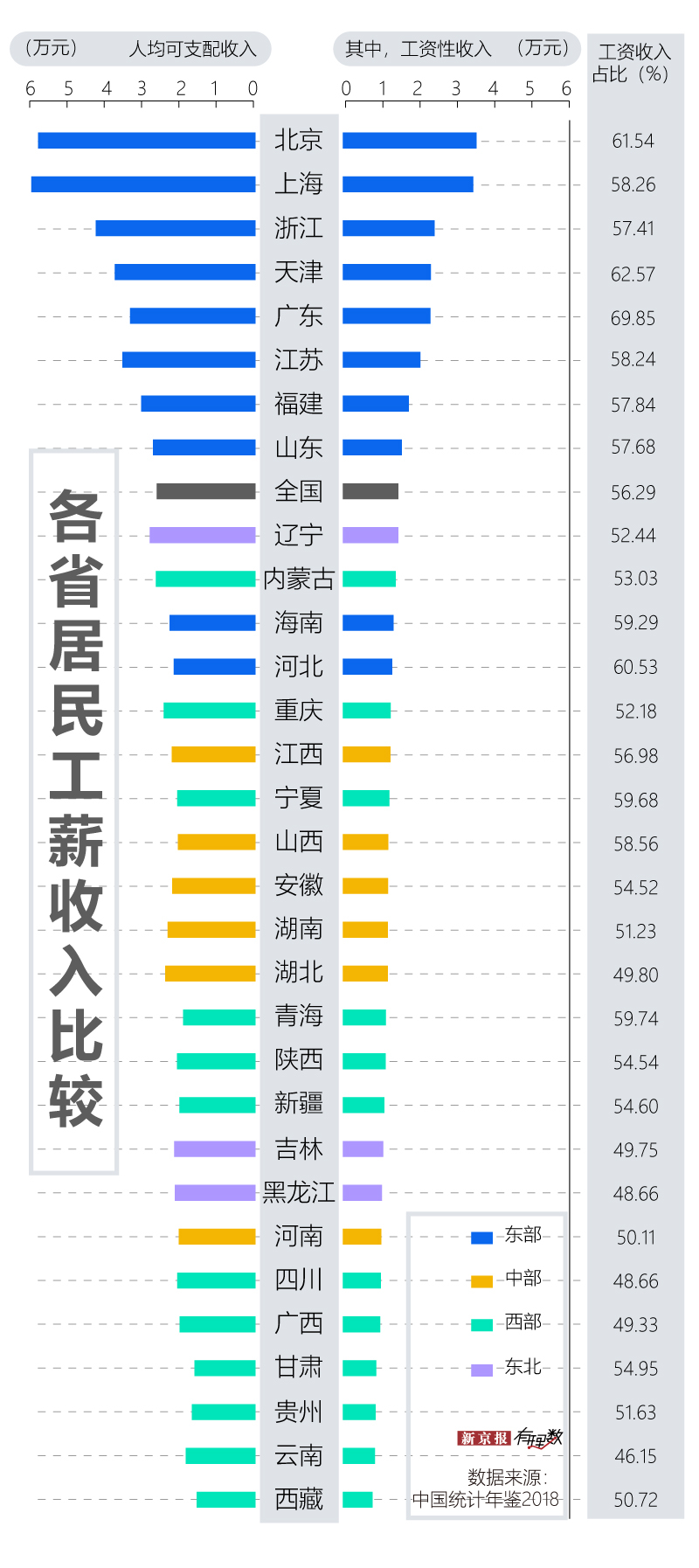 《中國統計年鑑2018》公佈的數據展示了更為細分的省級工資收入差,數據顯示,居民工資性收入較高的省份均為東部省份。