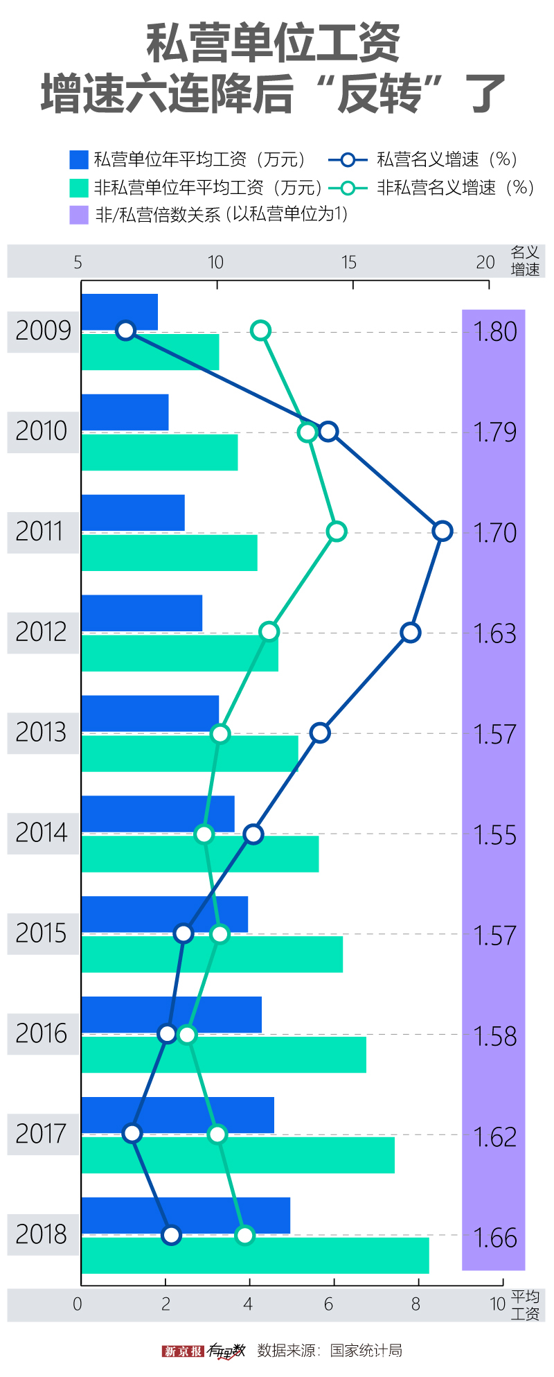 不過,2018年,私營與非私營單位工資增速‘缺口’收窄0.5個百分點,兩者間收入增速差距縮小。有分析認為,定向降準、減税降費等一系列針對小微企業、民營企業的激烈性政策措施發揮了作用。