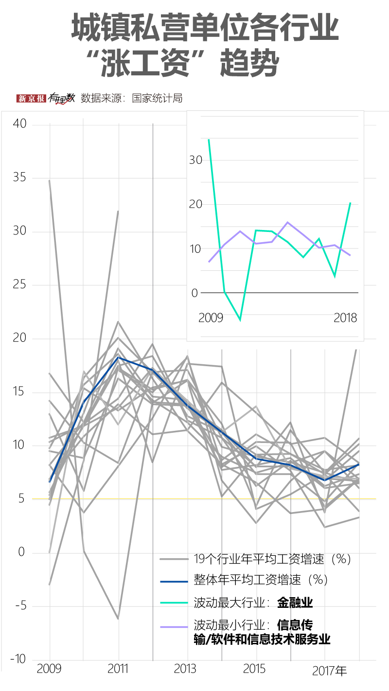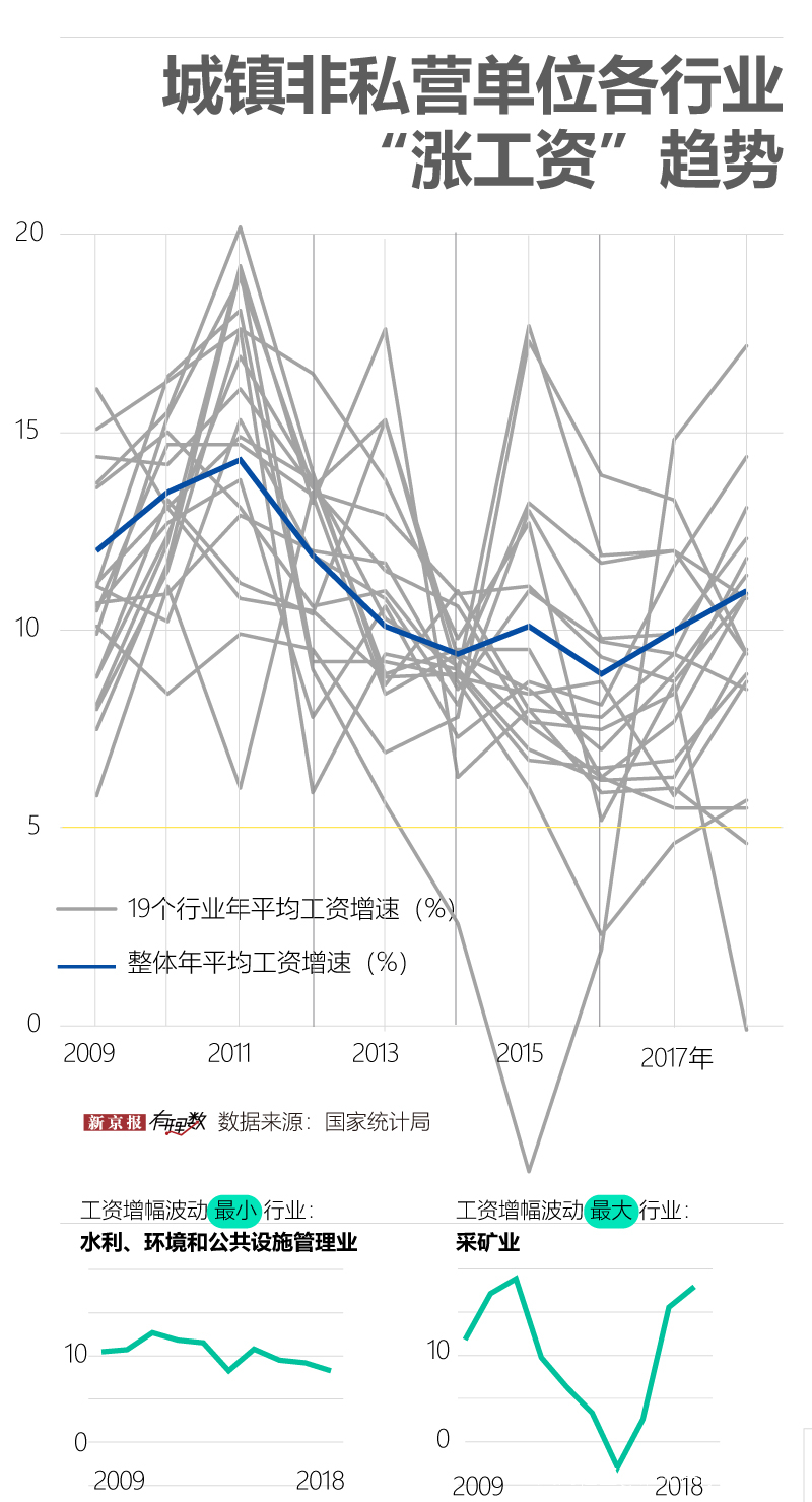 具體行業而言,有些行業的漲工資節奏很“任性”。近年處於調整期的非私營單位採礦業、私營單位的金融業,工資年增長率都處於較大波動狀態,而非私營單位的水利、環境和公共設施管理業和私營單位的信息傳輸、軟件和信息技術服務業相比較而言則保持着最穩定的增長。