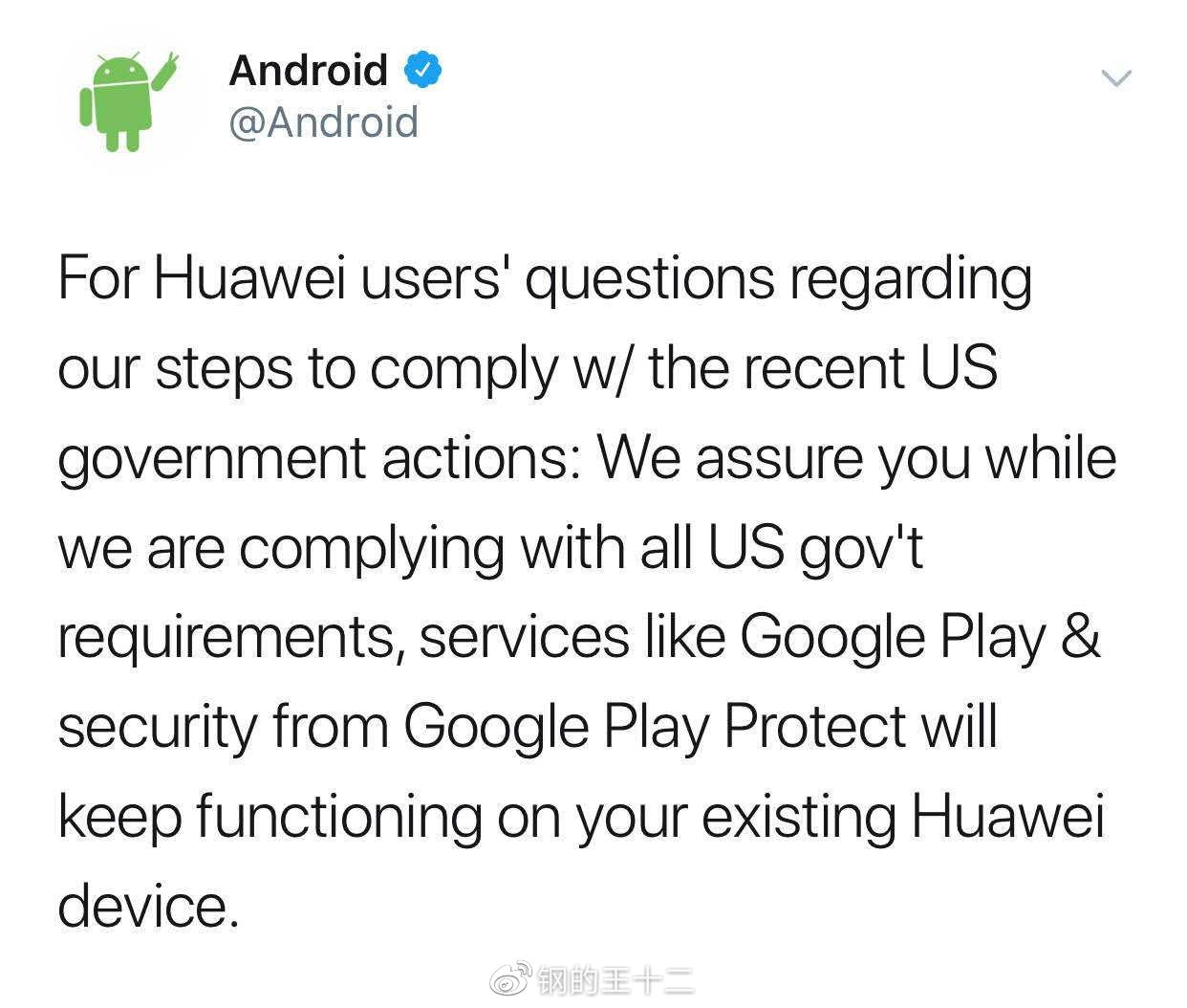 目前來説,中國市場由於國家戰略層面提前預支了北美資本控制互聯網公共基礎設施帶來的安全威脅,而做出來現在看來十分睿智的決策,谷歌遵從美國政府的決定做出的中斷協議,對中國市場沒又很大影響,而主要在西歐日本南太,影響較大。而華為今天下午官方也發佈了一個通告,佐證了此觀點: