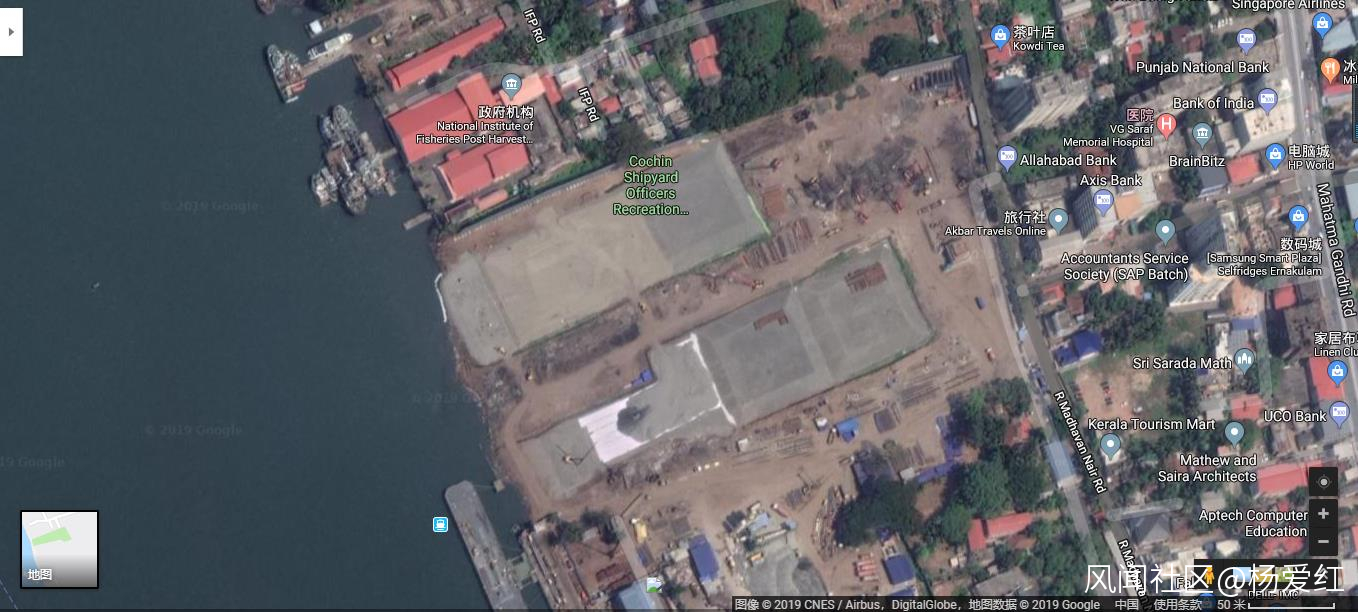 待到最近楊愛紅查看科欽造船廠的衞星照片,已經能看到新船塢的部分混凝土地基了!