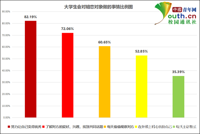 另一方面,大學生曾經為暗戀對象做過哪些事情?調查指顯示,82.19%的大學生選擇“努力讓自己變得優秀”,72.06%則是去“嘗試瞭解對方的愛好、興趣,並找到共同話題”,60.65%會“每天去偷偷觀察對方”,52.85%選擇“在外貌上精心裝扮自己”,35.39%則會“每天主動聯繫”。