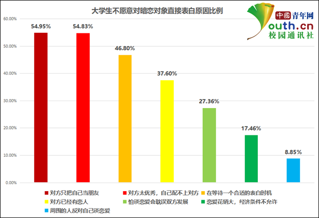 那麼,造成大學生不願意表白的原因有哪些?54.95%和54.83的大學生分別選擇“對方只把自己當朋友”和“對方太優秀,自己配不上對方”;46.8%選擇在“等一個合適的表白時機”;37.6%表示“對方已有戀人”;27.36%“怕談戀愛會耽誤雙方發展”;17.46%認為“戀愛花銷大,經濟條件不允許”;“周圍人反對自己談戀愛”僅佔8.85%。