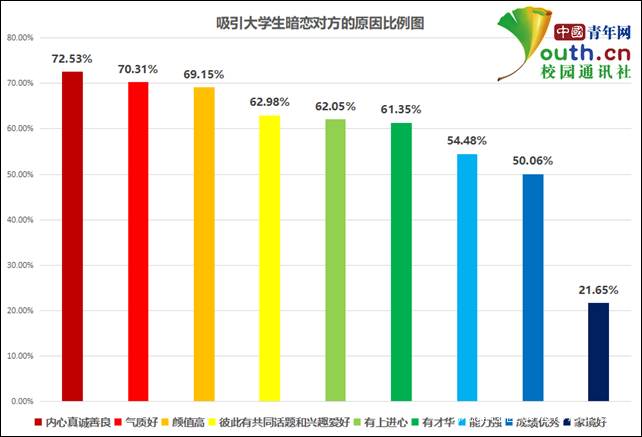 被暗戀的對象身上有哪些優點吸引着大學生?調查顯示:暗戀對象“內心真誠善良”“氣質好”“顏值高”選擇最多,各有72.53%、70.31%和69.15%學生選擇;另外,62.98%的大學生選擇“彼此有共同話題和興趣愛好”;62.05%選擇有上進心;61.35%選擇有才華;54.48%選擇能力強;50.06%選擇成績優秀;而家境好則僅有21.65的大學生選擇。