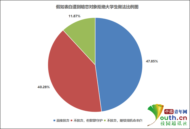 當對暗戀對象表白遭到拒絕時,大學生會怎麼做?調查顯示,47.85%的大學生在表白遭受拒絕後,會直接選擇放棄;40.28%的大學生表示,不會放棄,但會默默守護對方;11.87%的大學生則表示,不放棄,繼續找機會表白。