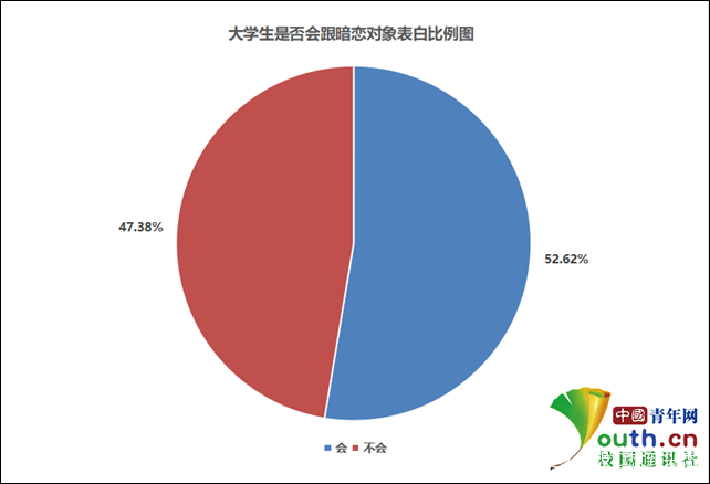 大學生是否會跟暗戀對象表白?根據中國青年網記者調查,52.62%的大學生選擇跟暗戀對象表白,47.38%則選擇不會表白。