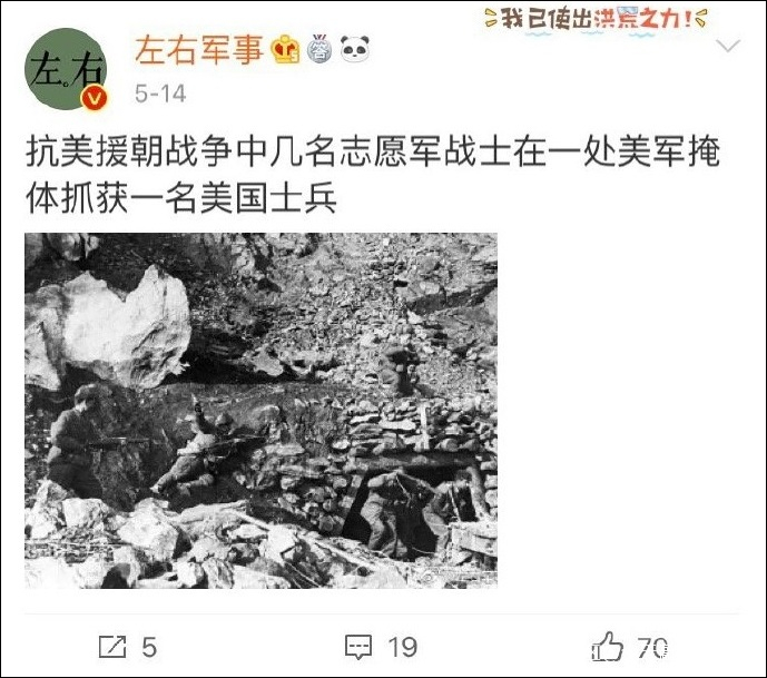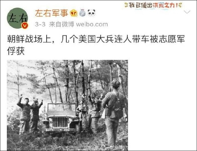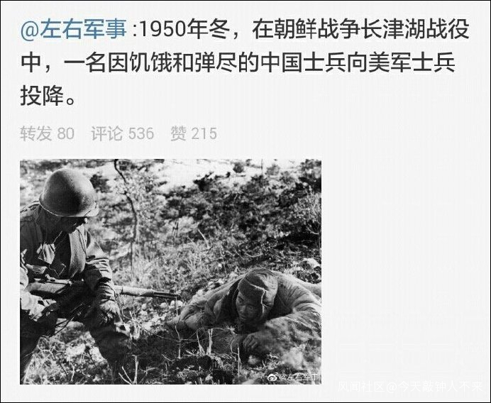 知名的軍事博主@左右軍事 稍晚時分發布圖片並配文稱,“1950年冬,在朝鮮戰爭長津湖戰役中,一名因飢餓和彈盡的中國士兵向美軍士兵投降。”