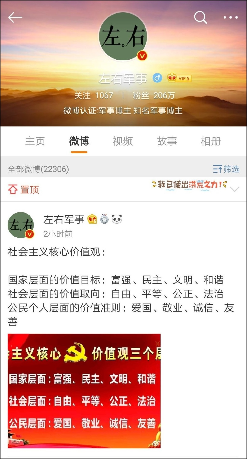 如果真心誠意道歉,並將爭議微博刪除,大家倒也能對這個博主表達諒解。但是在道歉之前,該軍事博主卻發佈一則涉及社會主義核心價值觀的微博,並將該微博進行置頂↓↓