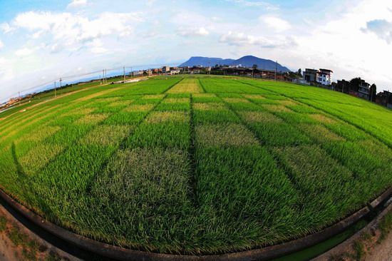 如圖,典型的轉基因水稻實驗田,可以明顯看出水稻是平均同等面積的交替種植,保證對比組環境條件一致
