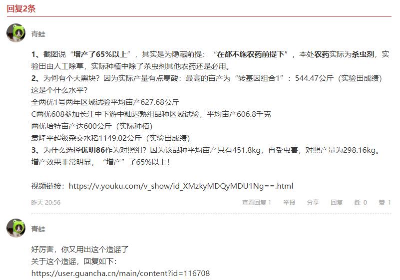 首先,我們的爭論起點是該用户對我所舉證的轉基因水稻增產對比試驗聲稱“轉基因作物的增產實驗不合理”,認為這個實驗不可信。