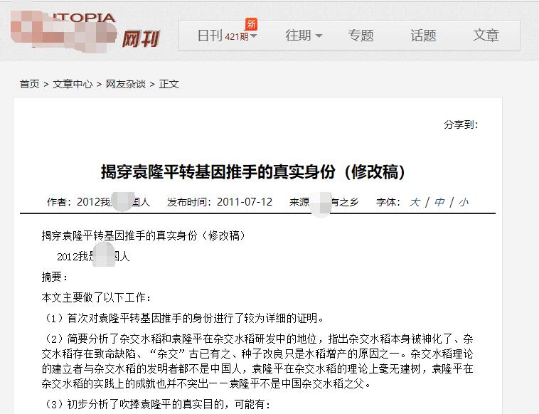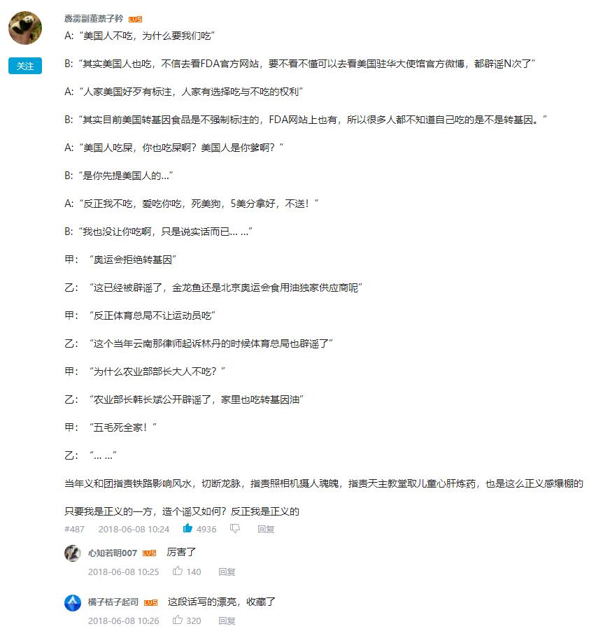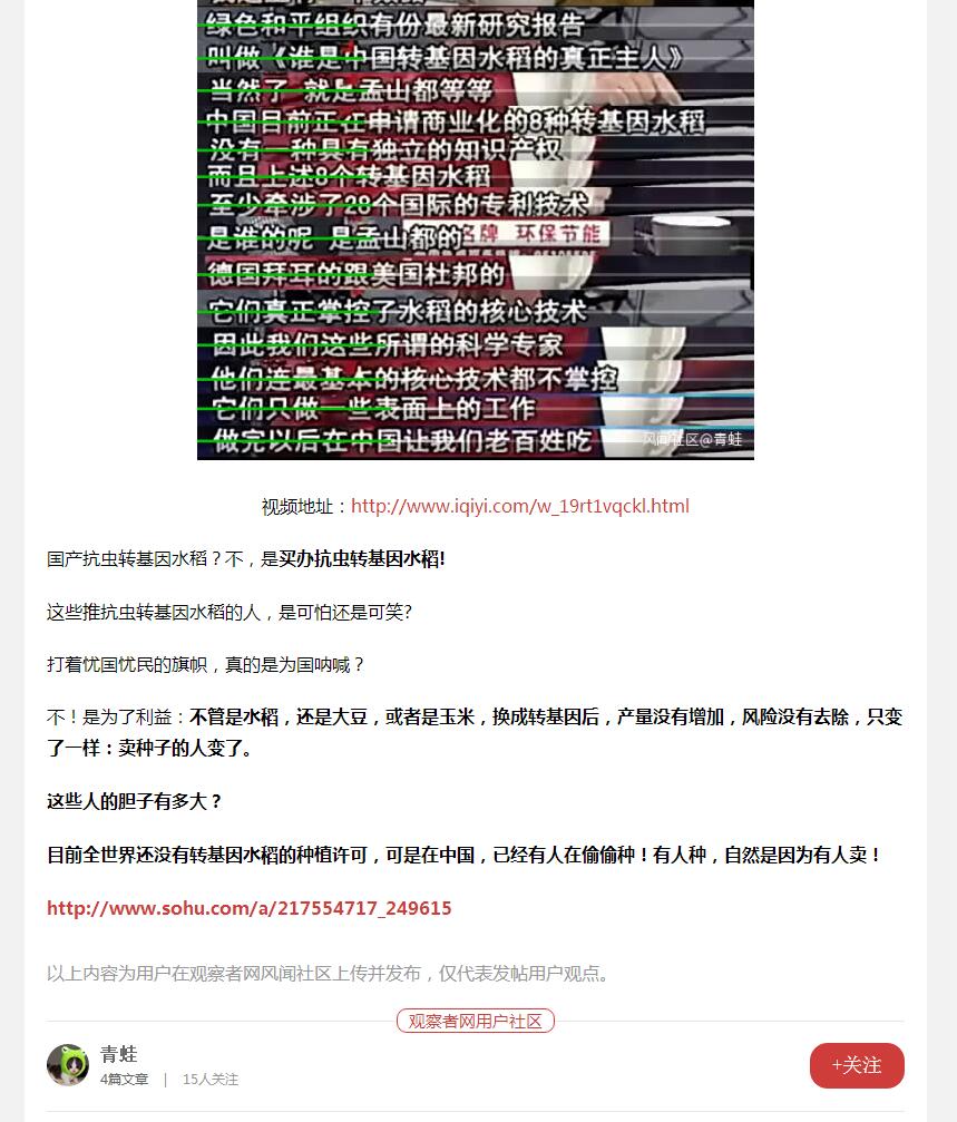 一個叫做 @青蛙 的用户接連發表了數篇文章,聲稱別人以“用謊言挺轉基因”,雖然文章下面有大量網友火眼金睛指出了其文章中的各種漏洞和邏輯錯誤,但不妨礙一些人進行無腦的吹捧。