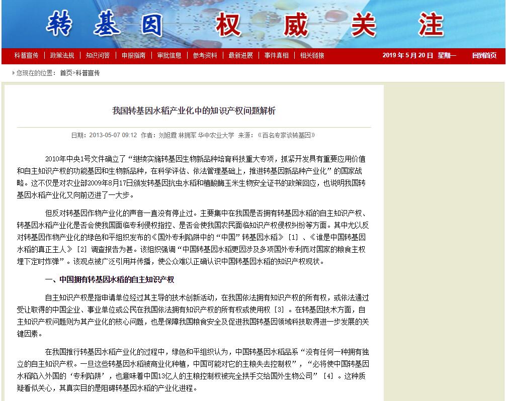 農業部官方網站的轉基因專欄中專門為“華恢一號”的知識產權問題開闢了單獨的專文解疑,作為政府權威網站,可靠性在我國是最高的。文中明確表達**“轉基因抗蟲水稻華恢一號擁有完全自主知識產權……中國在轉基因水稻新品種的培育上,不可能掉進外國的‘專利陷阱’。”**徹底駁斥了相關我國轉基因水稻有外國基因的謠言和傳聞。作為公眾,請問你是信任一個屢次造謠的台灣籍經濟學家,還是信任政府權威解釋呢?當然有些人肯定有不同意見,覺得中國政府不可信,這不在本文討論範圍呢。