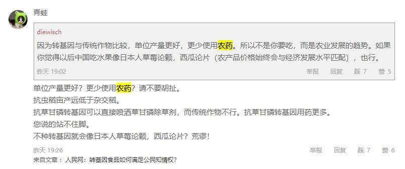 而就是這個 @青蛙,同樣在他另外一些回帖中我們看到,他大肆傳播“轉基因作物不減少農藥使用”這樣一個謠言。