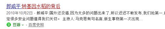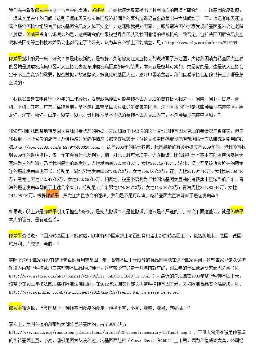 既然是上古舊聞,近10年過去了,肯定有相關討論,我們再度對郎鹹平與轉基因關鍵詞進行搜索。結果發現了更多與此人有關的結果,其中最有力和全面的反駁來自於生物學博士方舟子的文章,幾乎涵蓋了郎鹹平的所有觀點,文中大量的事實證明了郎鹹平在轉基因問題上的多次造謠。@青蛙 曾宣稱自己對轉基因有中立態度,認為客觀和公正看待問題是很好的做法,那我們不僅要問,他在引用郎鹹平觀點的時候,是否查證了早就存在的對郎鹹平觀點的反駁呢?而對於方舟子對郎鹹平的質疑,我們並沒有看到郎鹹平針對性的回應。