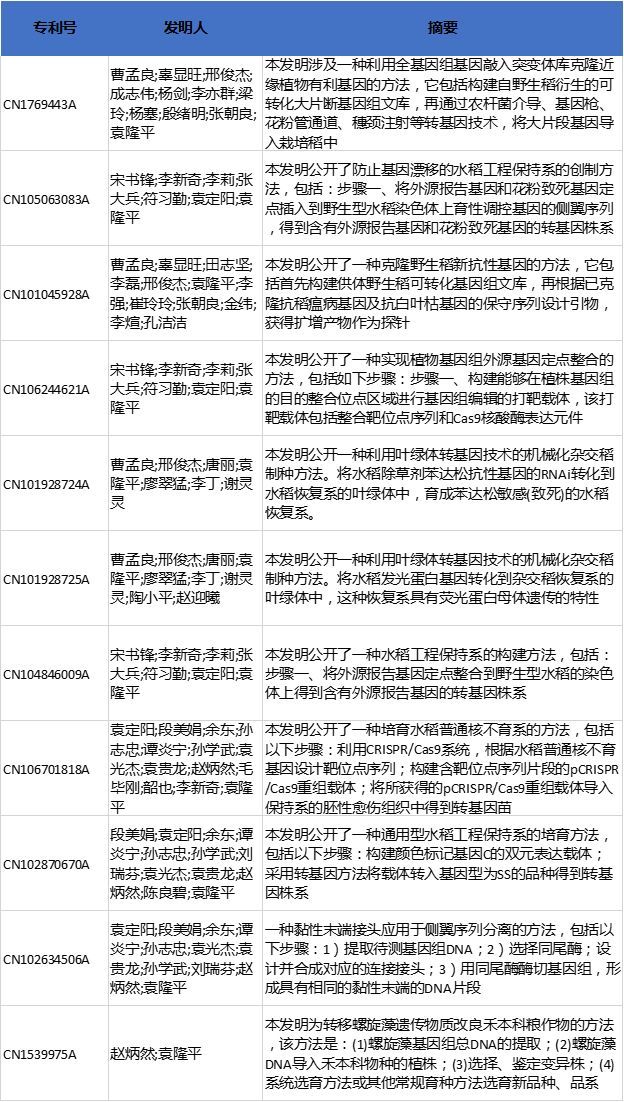 在專利網站查詢的袁隆平院士署名的轉基因、外源基因轉換專利名錄