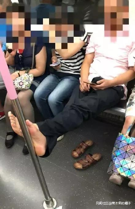 在地鐵上舒舒服服地脱鞋,把腳放在別人要用來當扶手的欄杆上的。