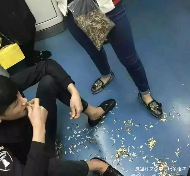 在地鐵上肆無忌憚地嗑瓜子、啃鳳爪,把瓜子皮、骨頭吐一地的。