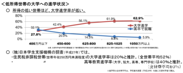 依據日本文部科學省公佈的資料顯示,家庭年收入越低,學生的大學升學意願越低,通常高中畢業後就直接就業。