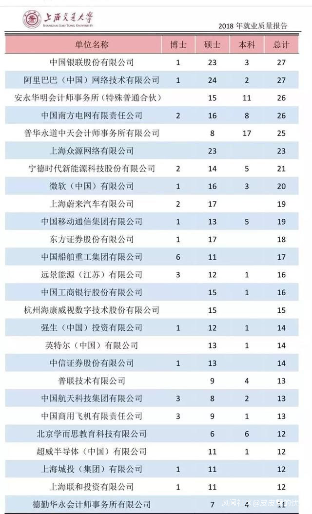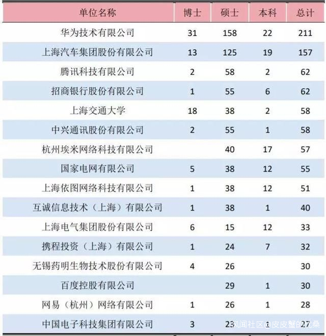 和復旦學子不同,交大學子對外企的熱衷度似乎不太高,前16個就業單位中,沒有一個是外企,央企也只有兩個。其他大部分為上海本地企業和深圳、杭州的科技公司。