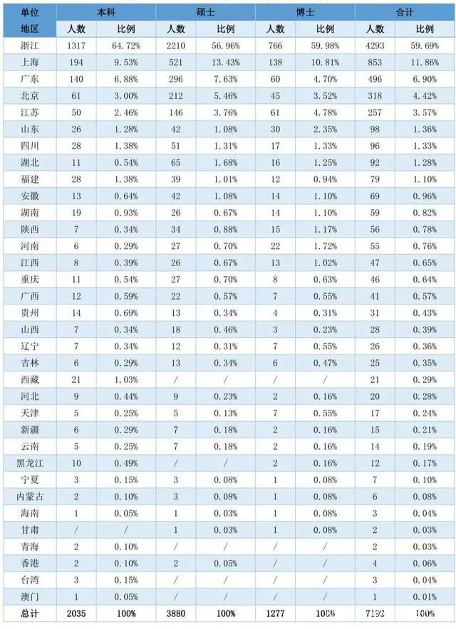 浙大畢業生留浙比例約為59.69%,高於北大清華的留京比例,但低於復旦交大的留滬比例。