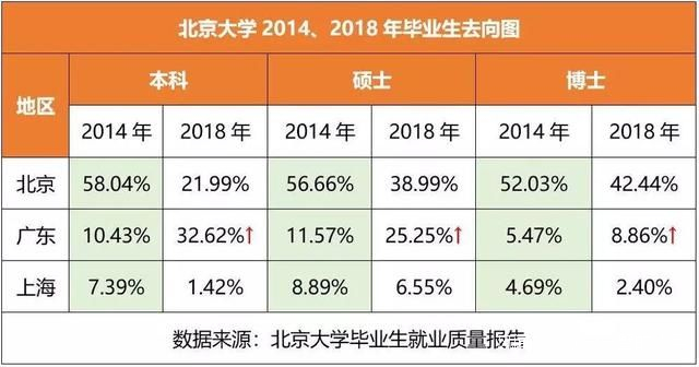 數據顯示,北大畢業生的留京比例,近年來亦呈現降低趨勢。2014年,北大本科畢業生的留京比例還多達58.04%,到2018年則降低到21.99%,而去到廣東的比例則增加至32.62%。
