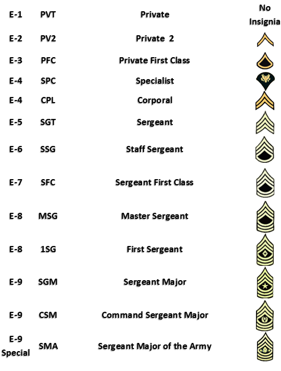 美國陸軍士兵和士官有9級軍銜,從E-1到E-9,E是Enlisted的縮寫,這個不好説是徵兵還是募兵,因為都叫enlist,反正是兵就是了。軍官軍銜的對應簡稱就是O-1到O-10。