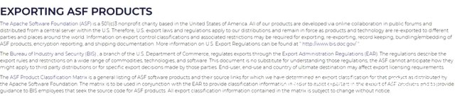 有很多開源軟件,都會選擇使用 Apache License 2.0,但是這並不代表這個開源項目已經屬於 Apache 基金會,只有當項目被明確的捐贈給 Apache 基金會,才是屬於 Apache 基金會的項目,受到美國法律的監管。但是,只要這個項目不涉及加密,同樣不在 EAR 管制範圍。