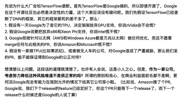 他表示:“任TensorFlow成為世界上佔統治地位的人工智能開發平台對世界是危險的。儘管這個平台目前是開源的,但是隨着時間的推移,人工智能變得越來越強大,這個系統會變得極端複雜到失去透明性,而且會很可怕的變成全世界數據,計算,硬件,編譯器等的標準制定者。這樣會導致一個不健康的生態,阻礙年輕人掌握技術的自由,讓個人,公司甚至國家在人工智能領域的自主發展,最終被一家商業公司所控制。這不是危言聳聽。可惜現在絕大部分人都還意識不到這點。“