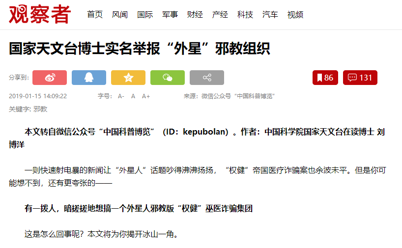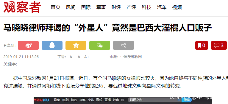 **凱風網****編者按:**今年元月,劉博洋博士在網上發表文章《實名舉報“外星”邪教組織》,列舉了昴宿星人、雷爾教、天堂之門、銀河聯邦等中外打着UFO、外星人旗號的邪教,認為近年來通過網絡開設系列講座《我遇到了外星人》的馬曉曉,與上述邪教一脈相承。本網發表《馬曉曉拜謁的“外星人”竟然是巴西大淫棍人口販子》,揭露馬曉曉講座的內容荒誕可笑。上述文章被人民日報、中國網、中國經濟網、中青在線、中國台灣網、環球時報、觀察者等網站轉載或跟進報道。“外星人”邪説也引起了國內科技界、宗教界和反邪教界的關注。