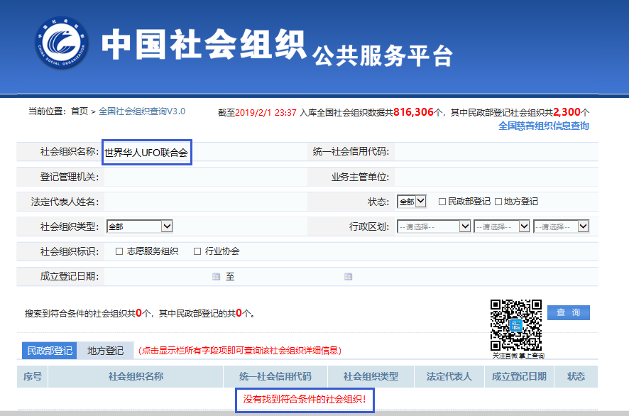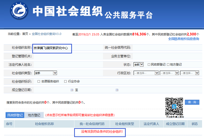 網上關於馬曉曉的介紹中,大都提到她的兩個身份——世界華人UFO聯合會的理事兼法律顧問、京津冀飛碟探索研究中心飛碟信息調查研究員。她就是以這兩個身份在網上傳播《我遇到了外星人》。但登錄民政部的中國社會組織公共服務平台網站,查詢這兩個組織,沒有任何結果。也就是説,這兩個組織並沒有在中國民政部門登記註冊。