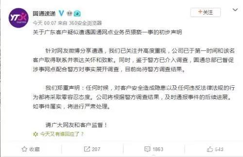 20日凌晨,圓通快遞在官方微博發佈聲明稱,“針對網友微博分享遭遇,我們已關注並高度重視,公司已於第一時間和該名客户取得聯繫並表達關懷和致歉。同時,鑑於警方已介入調查,圓通總部已督促涉事網點配合警方對事實展開調查,目前尚待警方調查結果。”