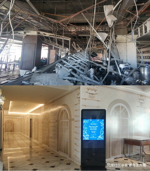 遇襲後的金斯伯裏酒店內部部分區域(上),已被裝飾圍起(下)。圖/劉馨恬