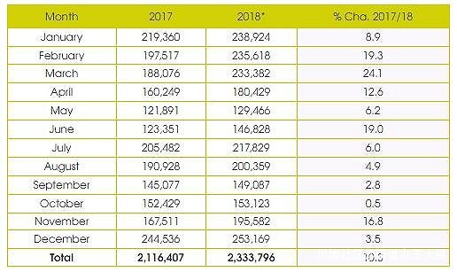 2017年和2018年,斯里蘭卡每月遊客量統計。數據來源:斯里蘭卡旅遊局