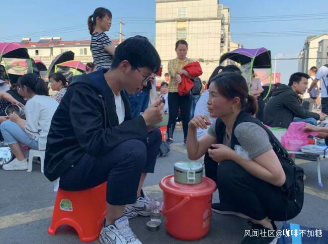 5月,臨近高考,毛坦廠的酒店幾乎滿房。午飯時間,送餐的陪讀家長湧出,和放學的孩子坐在校門口一起吃飯。一個陪讀媽媽把兩個菜、一個玉米湯從豆綠色的保温桶裏拿出,把小木凳留給兒子,自己蹲着,靜靜地看他扒飯。家長和孩子很少説話,人堆裏能聽到鐵勺刮到飯盒的聲音。