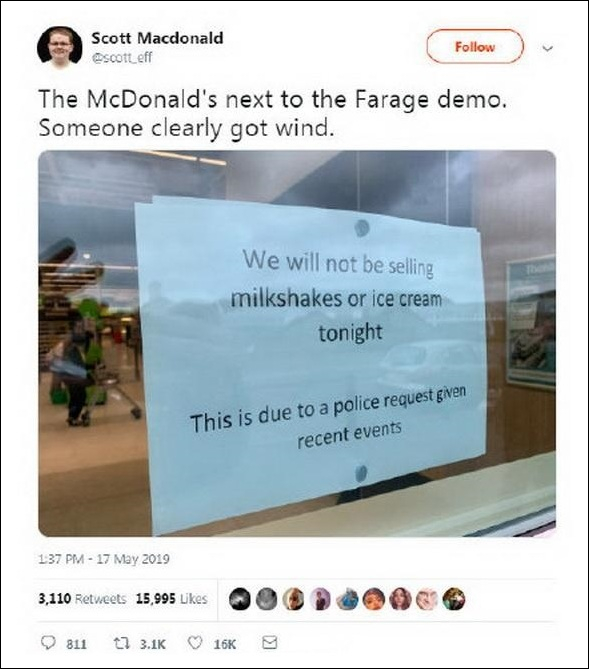 據英國《衞報》18日報道,由於擔心抗議者會拿奶昔砸英國脱歐黨領袖奈傑爾·法拉奇,警方要求法拉奇集會演説地附近的一家麥當勞餐廳暫停出售奶昔和所有麥旋風產品。
