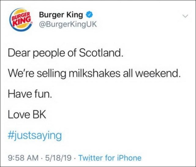 對此,麥當勞的“對家”漢堡王趁機在推特上表示:我們整個週末都有奶昔賣。
