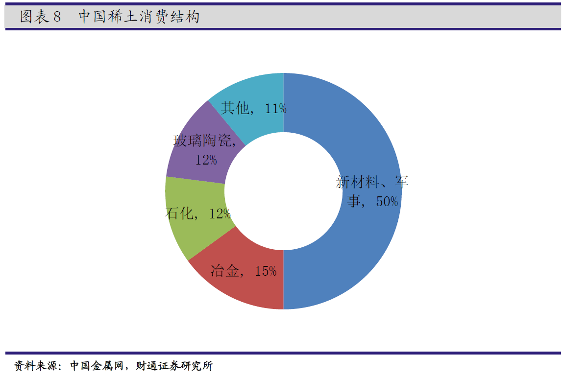 稀土主要應用於軍事、冶金、石油化工、玻璃陶瓷、新材料等領域。數據顯示,在我國,一半以上的稀土被用於軍事和新材料。
