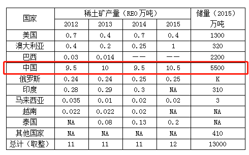 中國是世界上稀土資源最豐富的國家,素有“稀土王國”之稱。隨着礦產勘探技術的不斷進步,近年來我國探明的稀土儲量也在不斷增加。中國稀土學會地採選委員會提供的我國已探明的稀土資源儲量為5200萬噸,佔全世界稀土儲量的50%以上。而美國統計網的預估數據為5500萬噸(2015年,見下表)。