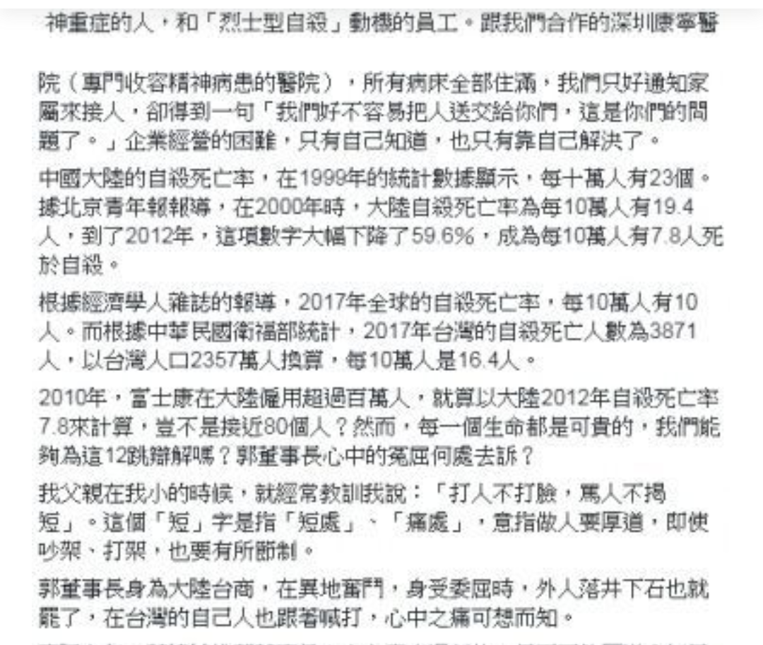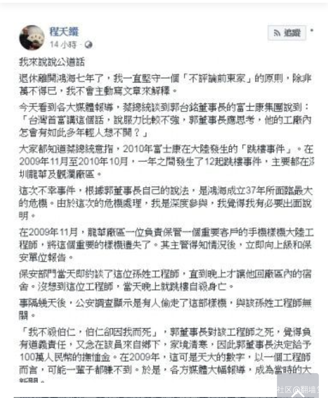 蔡英文昨(19日)要郭台銘好好反思,他的工廠裡「為什麼這麼多年輕人想不開」,事後郭台銘反擊拿往生者當競選議題,有失高度,並稱這是他創業45年來「心中最沉重的痛」;對此,鴻海集團前副總裁程天縱在臉書上聲援郭台銘,並且還原當年富士康跳樓事件的原委。