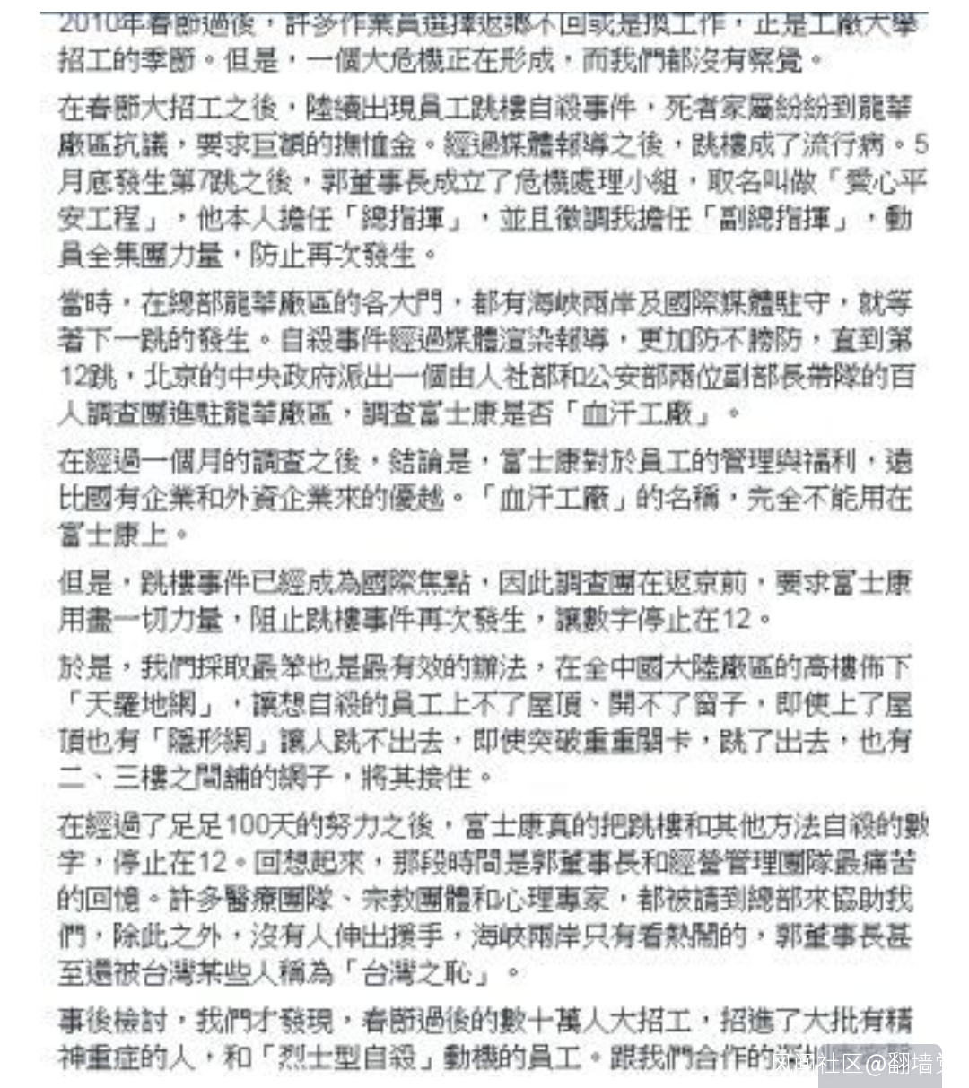 這位自殺的工程師是來自農村清華大學畢業在鴻海任職開發部門培養的工程師 當初他負責iPhone手機的 樣品 在廠內交由快遞公司寄到美國總部 當初交辦17隻的樣品 可是到了美國只收到16隻因此內部 所有的人員一直懷疑是他偷取樣品手機 在鴻海內部 產生很大的風波 所有的問題都矛頭指向這位清大畢業的工程師 因此這位工程師跳樓自殺 以表自己的清白 事後 查證 竟然是快遞公司人員監守自盜 偷走了一隻手機 為了這個事情 郭台銘和高層主管特別到他老家 向他父母親 致歉 並承諾願意扶養到他們終生 所以 這個事件發生以後 只要在鴻海跳樓自殺的人鴻海都會有撫卹金 因此才會有後面的20幾跳 整個事情的來龍去脈就是如此