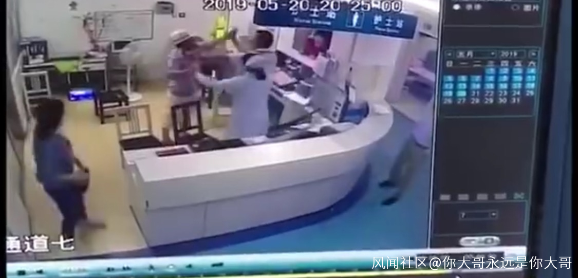 網傳監控視頻顯示,5月20日20時24分,一名戴白色帽子的男子突然衝進醫務站將電腦砸壞,又拉住一名醫生毆打,後又欲舉起板凳打人被周邊人攔住,隨後快速離開現場。