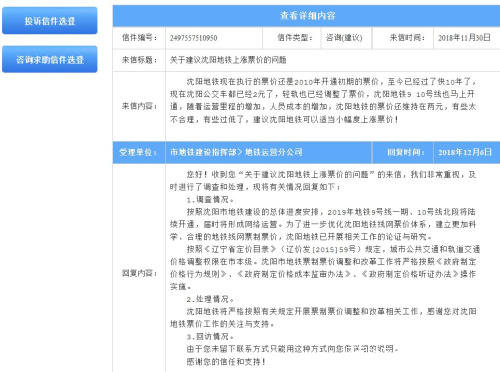 媒體報道稱,當時有瀋陽市民通過12345市民熱線投訴瀋陽地鐵票價太低,建議適當上漲。瀋陽12345市民熱線對此的回覆是:“收到您建議瀋陽地鐵上漲票價的問題,我們非常重視。”瀋陽地鐵運營分公司也回應稱,為了進一步優化瀋陽地鐵線網票價體系,建立更加科學、合理的地鐵線網制票價,瀋陽地鐵已開展相關工作的論證與研究,並將嚴格按照有關規定開展票制票價調整和改革相關工作。