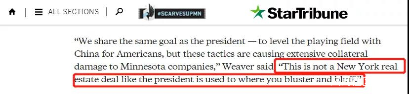 報道稱,明尼蘇達州2018年進口了約124億美元的中國零部件和產品,比從其他國家進口的都多。彙集了該州大型企業CEO的明尼蘇達州商業合作組織認為,關税造成的財務後果對他們的公司以及廣大美國消費者來説都是可怕的。執行董事查理·韋弗(Charlie Weaver)甚至喊話特朗普,“這可不像是總統習慣的紐約房地產交易那樣,可以隨便咆哮和虛張聲勢”。