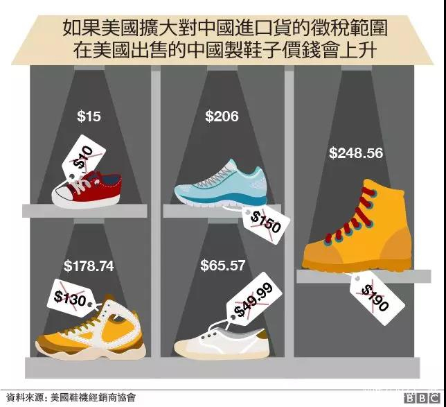 據美國鞋襪經銷商協會(Footwear Distributors and Retailers of America)估計,在25%的高關税下,童鞋的平均售價會從10美元漲到15美元,跑步鞋會從150美元漲到206美元、籃球鞋會從130美元漲到179美元、靴子則會從原來的190美元漲到249美元,其他種類的鞋子也會出現類似的漲價情況。