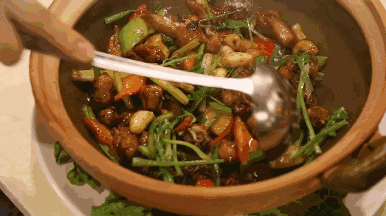 廣東菜裏還有一種做法叫**“啫啫”,就是將食材放入經極高温的火燒焗過的瓦煲內烹飪,常見的有啫啫黃鱔、啫啫滑雞、啫啫魚頭**等。各色材料剛一入煲,便立馬被燙得發出聲響。隨着湯汁的不斷收緊和快速蒸發,煲內發出“滋滋”的聲音,在粵語中叫做“啫啫”,“啫啫煲”因此得名。