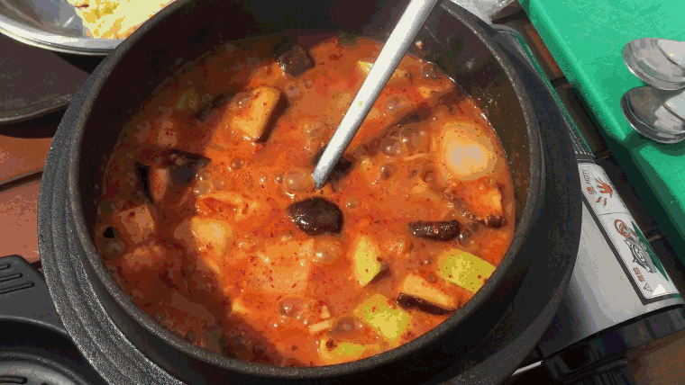 石鍋也是朝鮮族烹飪的慣用器具。大醬湯、泡菜湯、魚子湯、醒酒湯,無論名稱怎麼變,原料無非豆芽、角瓜、大豆腐、辣白菜的排列組合。但因石鍋温度高,湯水翻滾得熱烈,不時發出“咕嘟咕嘟”的聲響,辣椒麪也因此融合得均勻,所以格外好喝。面對冒着熱氣翻滾着上桌的石鍋湯,常常是迫不及待“吸溜吸溜”地啜飲,燙得味蕾紅了臉抗議。