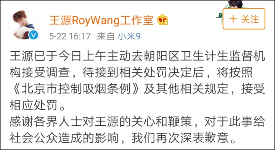 在王源工作室發佈的微博中,該工作室還表示,感謝各界人士對王源的關心和鞭策,對於吸煙一事給社會公眾造成的影響,深表歉意。