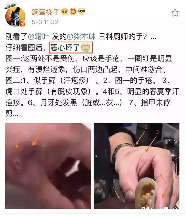不僅如此,老闆在之前製作壽司的照片中,手部有着明顯的瘡口,並且戴着手錶進行食材的處理。
