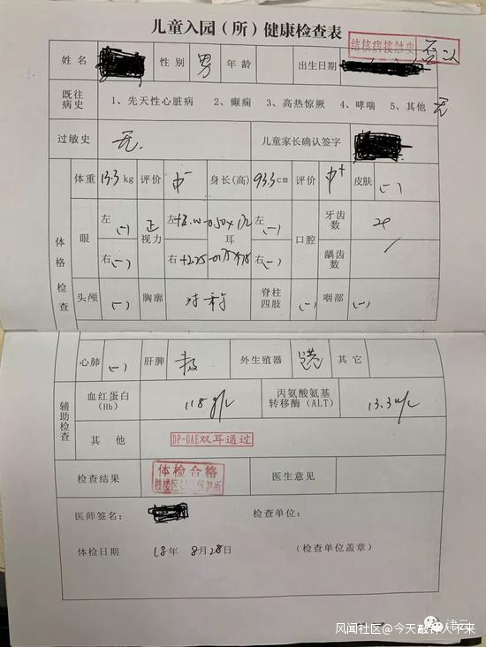 2018年8月28日,孩子做入園體檢也顯示正常。